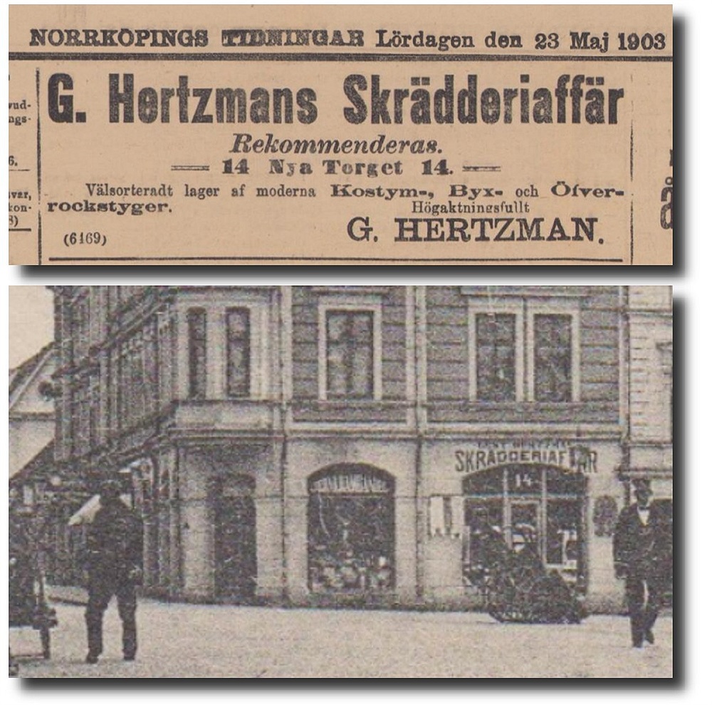 Skräddarverkstaden låg på Hospitalsgatan 25, runt hörnet till vänster om Hertzmans Skrädderiaffär på Nya Torget 14